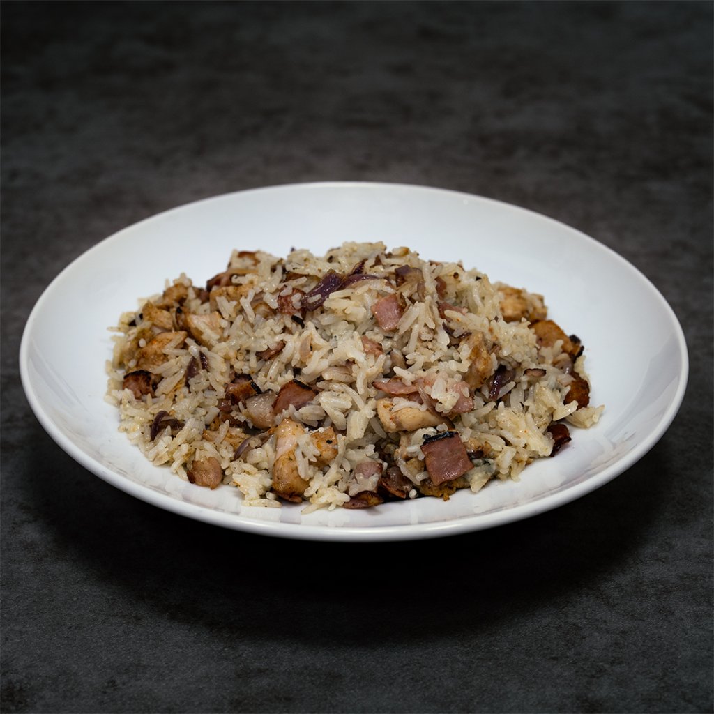 rýže basmati, slanina, červ.cibule, kuřecí prsa, smetana, niva