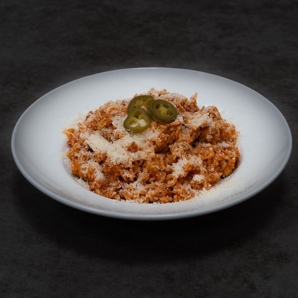 rýže basmati, chorizo, jalapenos, kuřecí prsa, sugo, parmezán